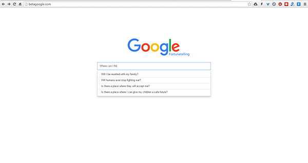 عندما تشرع في كتابة الحرف الأول على مربع البحث سيقترح عليك الموقع مجموعة من الأسئلة التلقائية من بينها : “أين يمكنني أن أجد مكانا آمنا؟” أو” متى تتوقف الحروب بين البشر؟ ” “هل سيتم جمع شملي مع عائلتي” وبعد الضغط على زر أخبرني بالمستقبل تظهر صفحة تحمل رسالة من الموقع تقول لك انه “بالطبع نحن لا نستطيع التنبؤ مستقبلك!“