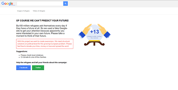 “ولكن 60 مليون لاجئ يسألوا أنفسهم كل يوم إذا كان لديهم مستقبل .لذلك استخدمنا هذا الموقع الوهمي لجذب اهتمامكم ! على ما يبدوالجميع مشغول بالتفكير بمستقبله . يرجى ان نتوقف للحظة والتفكير بمستقبل الاخرين .”