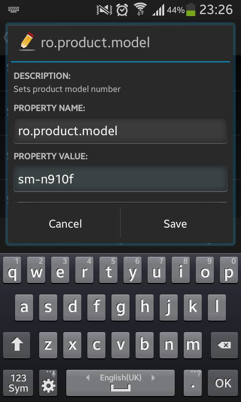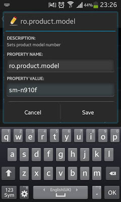 بعد ذلك ضع نفس الإسم الذي اخترت في كل من ro product name و ro product device و ro product board ثم إضغط علىSave و بهذا قد تكون غيّرت إصدار هاتفك بطريقة ذكية و سهلة لتتمكن بعد ذلك من تحميل أي تطبيق على بلاي ستور دون مشاكل، و كملاحظة فإن الخدعة صالحة أيضا بالنسبة للهواتف الأخرى غير سامسونج.